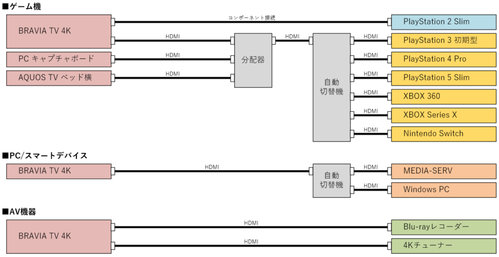 とりあえずは上図の形で繋いでおりまして、メインのテレビの他にベッドサイドに配置してある別のテレビにもPS2を除いた全てのゲーム機の映像と音声が届くように調整。
